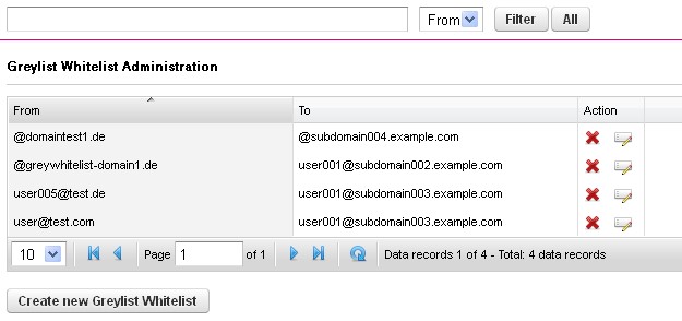 Hier können einzelne E-Mail-Adressen oder ganze Domänen zur persönlichen Greylist hinzugefügt / gelöscht werden. Mails von einem Absender auf der Greylist werden beim ersten Zustellversuch mit einem Fehler abgelehnt, sodass der Sender die erneute Zustellung anstoßen muss. Erst beim zweiten Zustellversuch wird die E-Mail in das normale Postfach zugestellt.