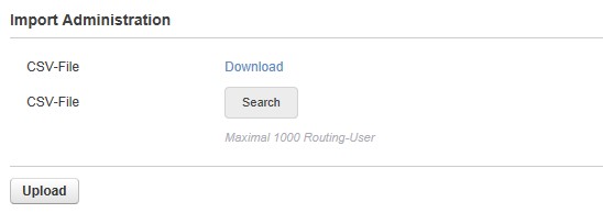 Import von User- und Domainlisten im CSV-Format. Nachdem die Datei mit den zu importierenden Daten aktualisiert wurde, wird diese mit Durchsuchen ausgewählt und mit Hochladen der Import gestartet.