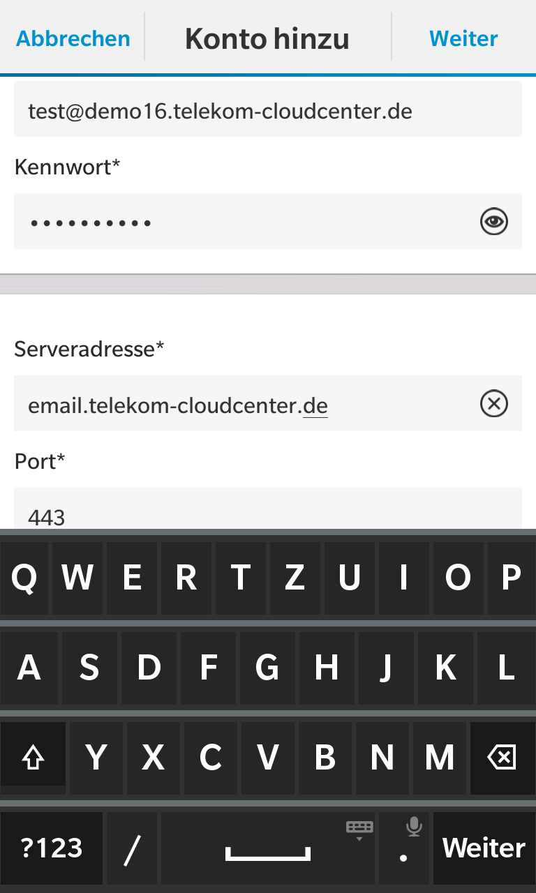 - Die weiterhin einzutragende Serveradresse lautet: email.telekom-cloudcenter.de